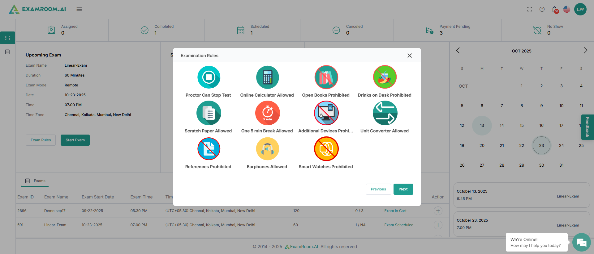 After acknowledgement, the Examination Rules appear. Review and click Next to proceed.