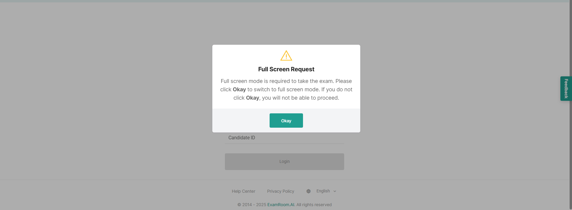 After being connected to the proctor, the test console screen will appear. A pop-up will prompt you to enter full-screen mode. Click Okay to continue.