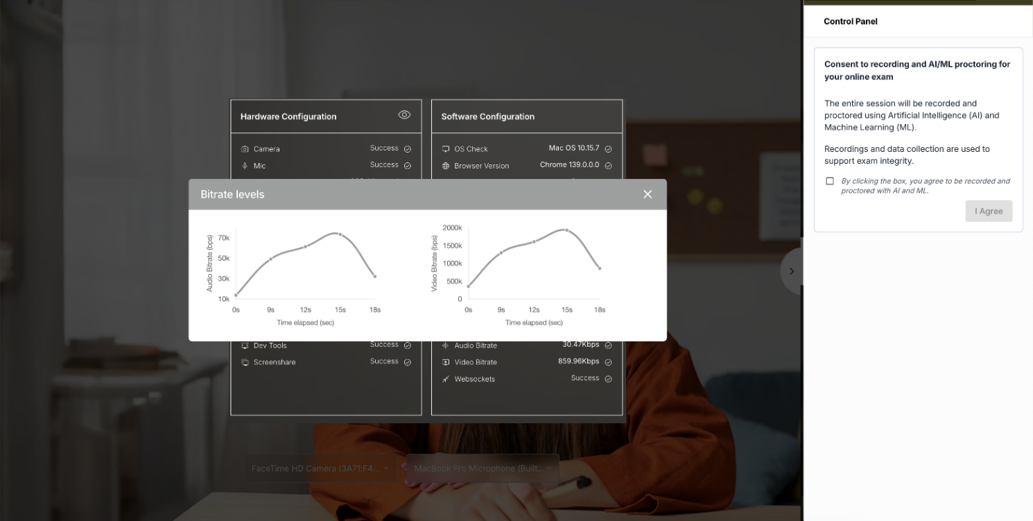 After clicking StartExam, the system automatically checks your device readiness by verifying your hardware, software, browser, and network configurations.