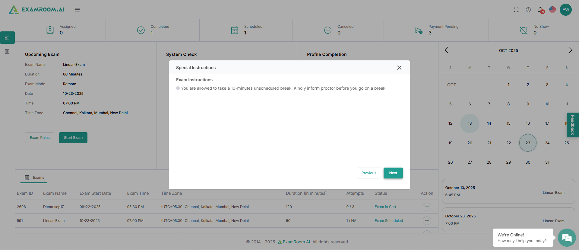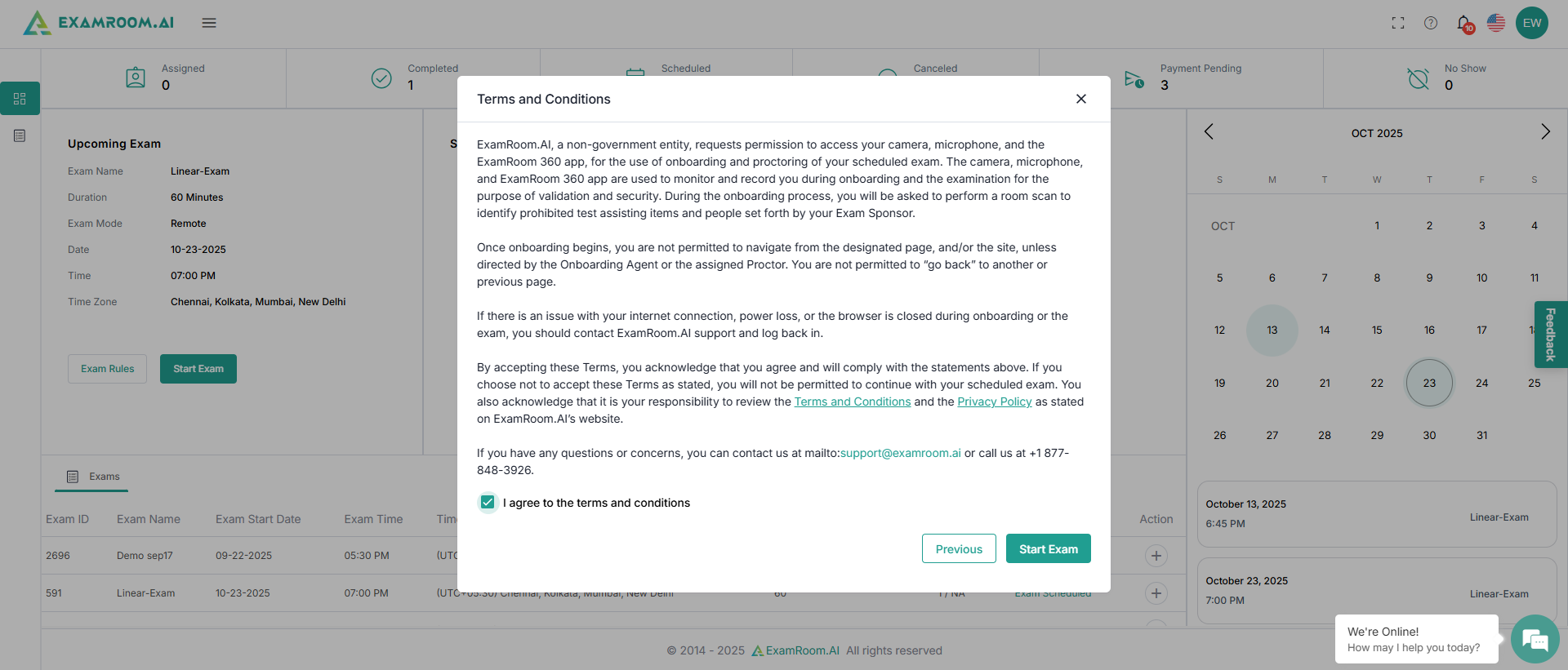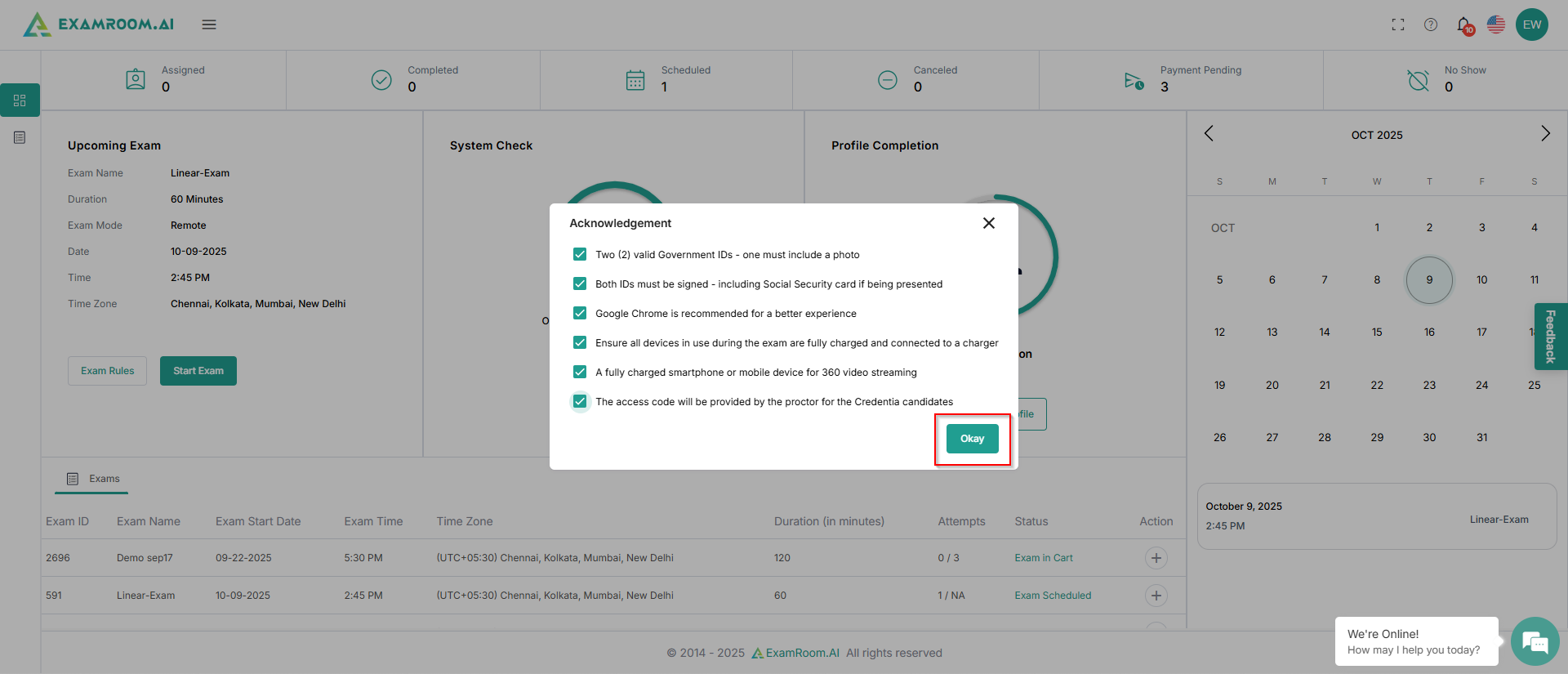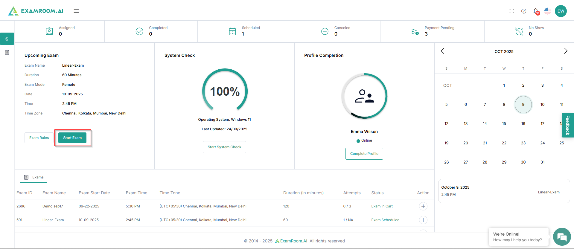 On the Candidate Dashboard, under the UpcomingExams section, click StartExam.