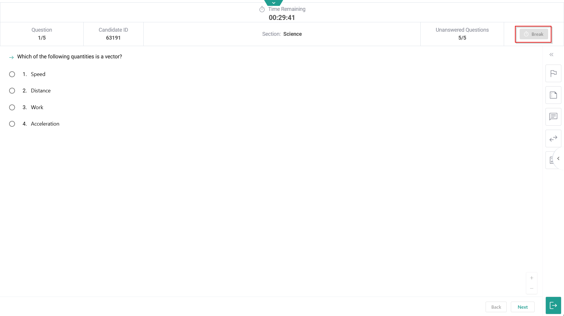 You may find a break icon (depending upon your exam sponsor and exam type), click on the break button to apply for a break during the exam. You will not be able to answer questions during the break period.