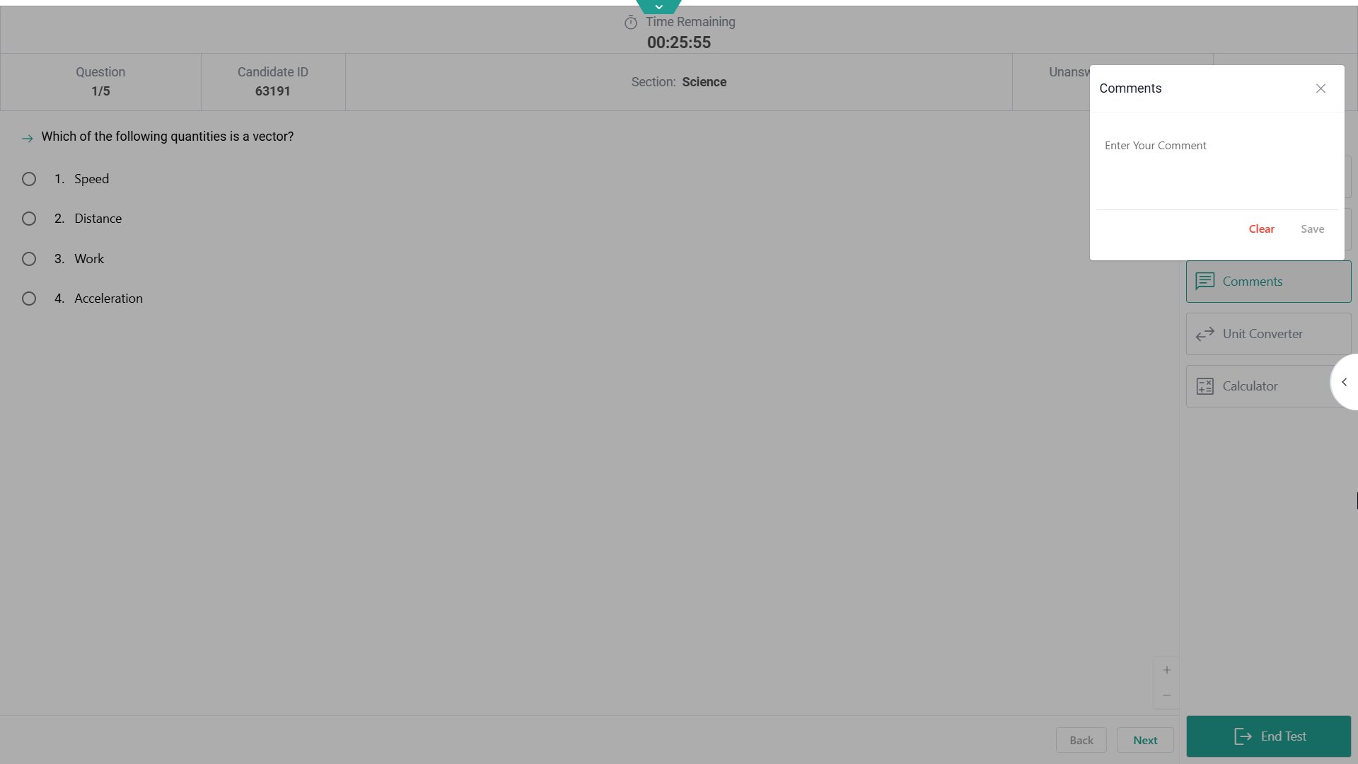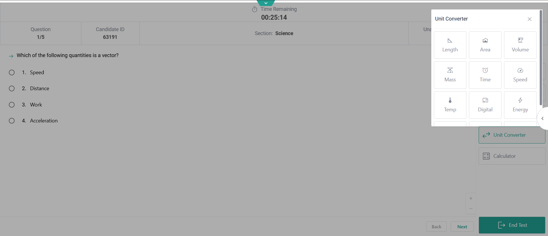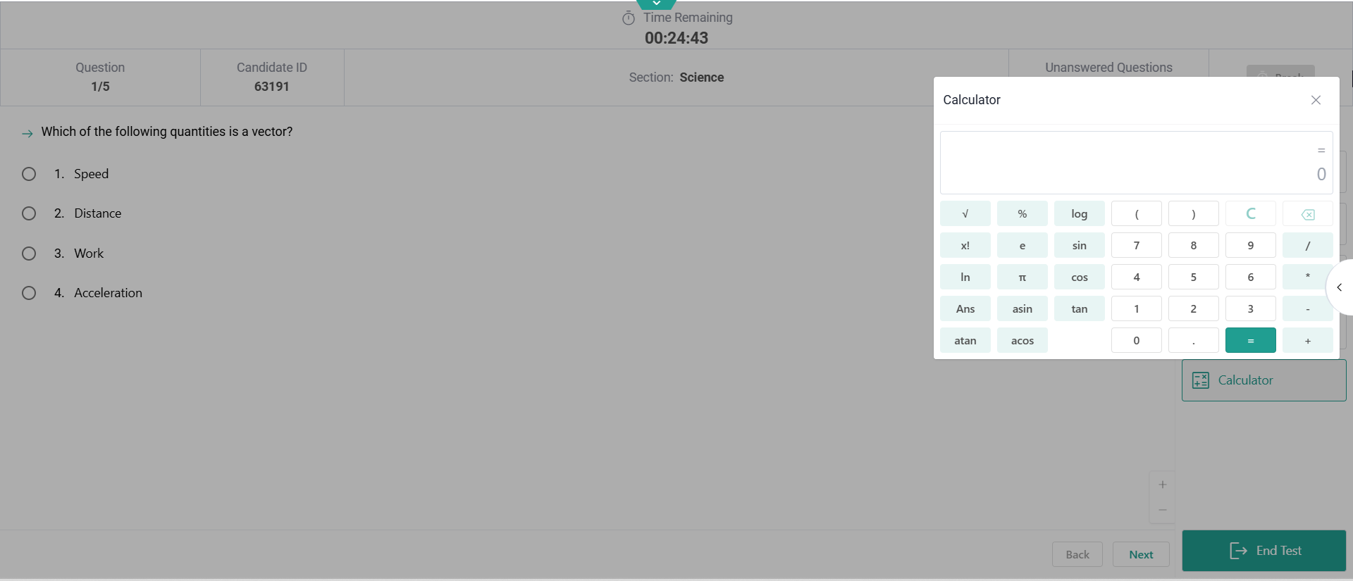 On the next screen, you'll see the number of questions, your Candidate ID, time remaining, and questions answered.