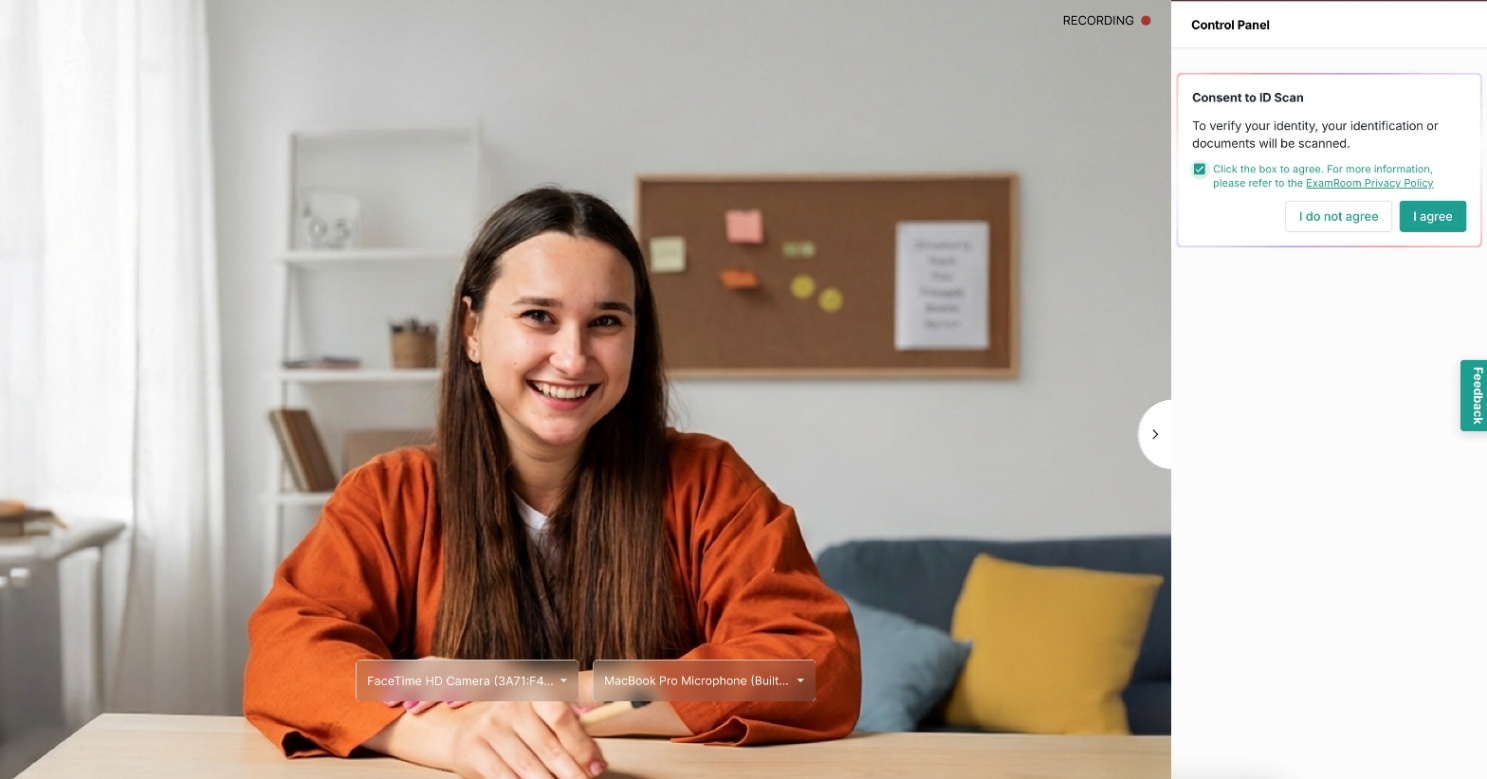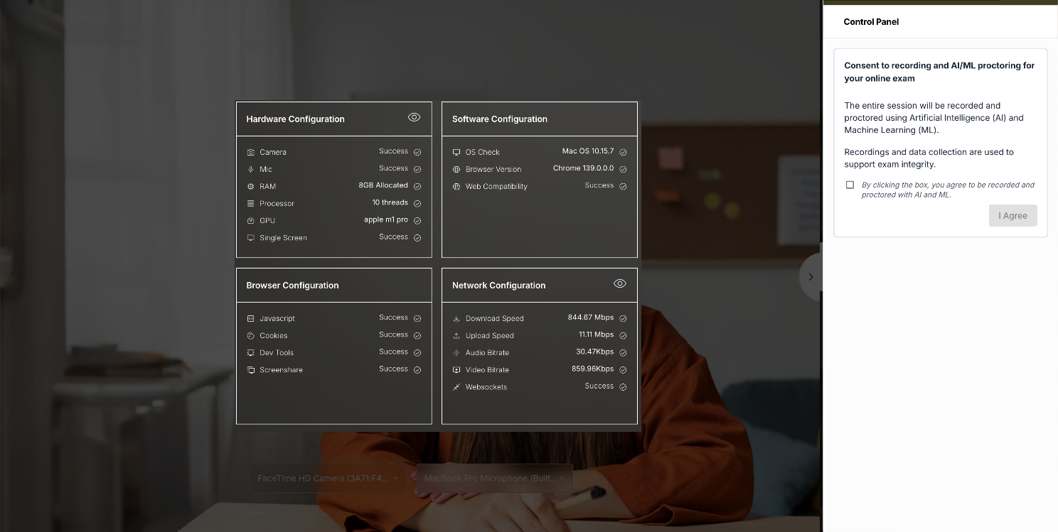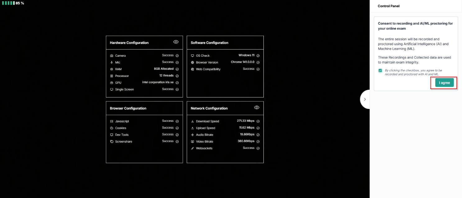 Now, in the control panel, select the checkbox and click IAgree to provide consent for recording and AI/ML proctoring.