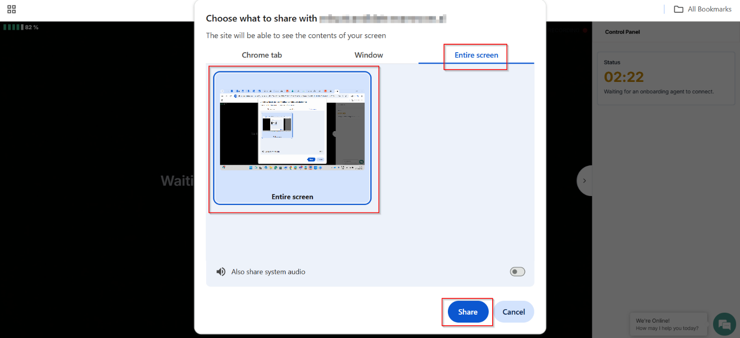By clicking I agree, a pop-up appears for the screen share. Select the entire screen option, click the small image in the center of the screen, and click Share.