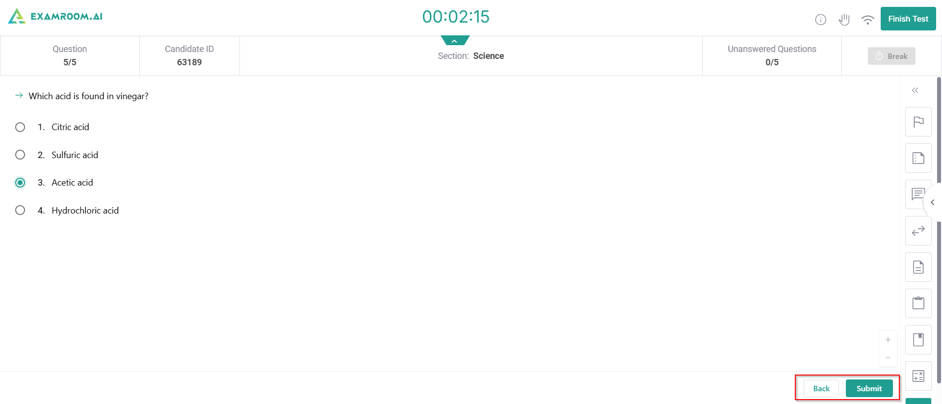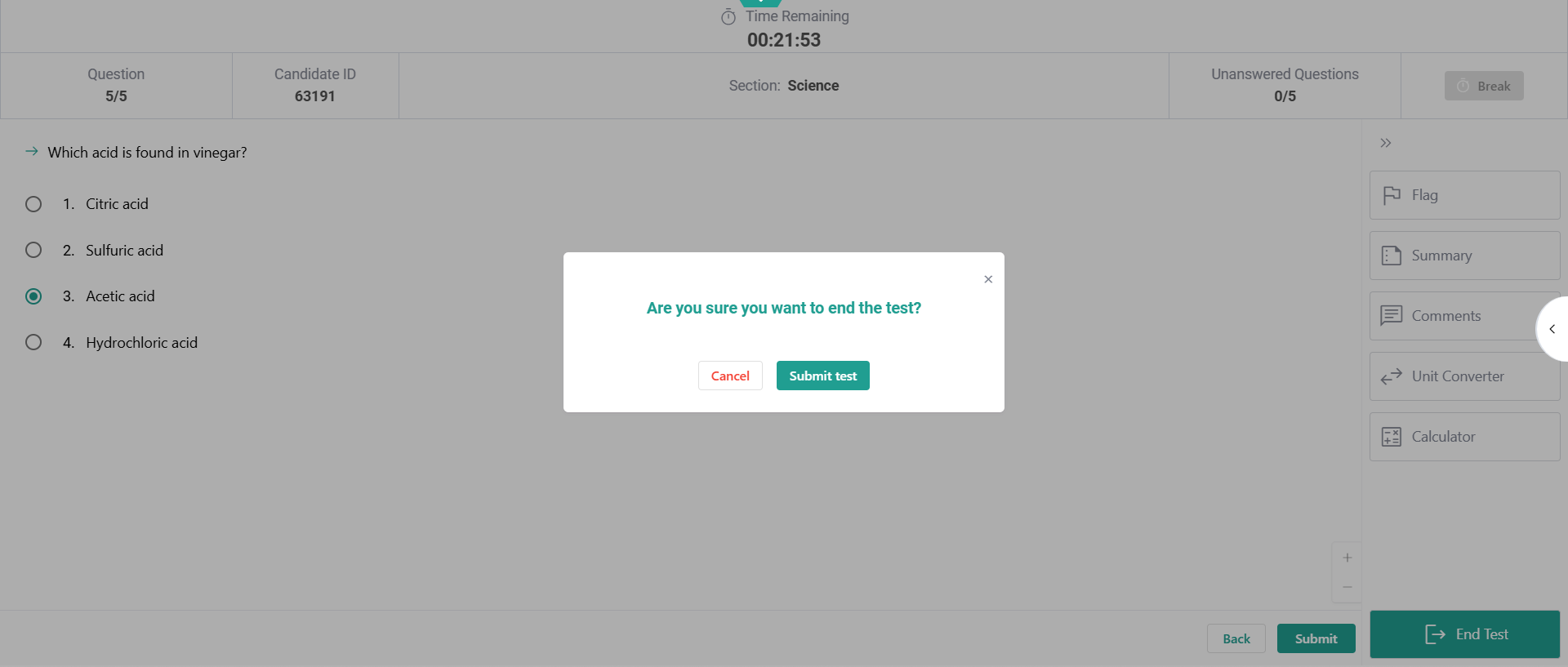 When you click Submit, a pop-up will appear asking if you wish to end the test. Click Submittest to submit your exam.
