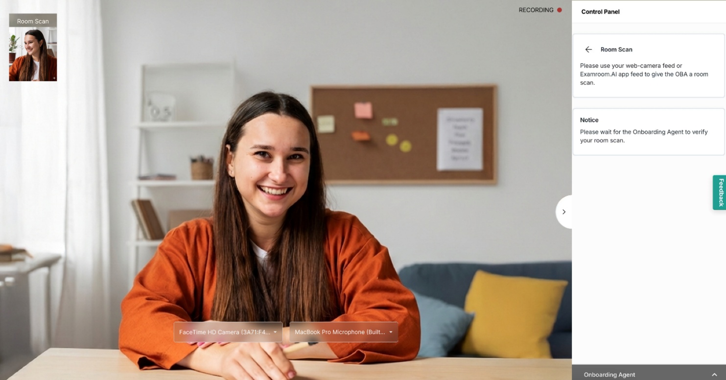 Now, to begin the process of Room Scan, the OBA triggers a QR Code display on your screen for you to scan and open the app on your phone, and place your phone as suggested by the OBA so they can see your entire testing area, including your computer.