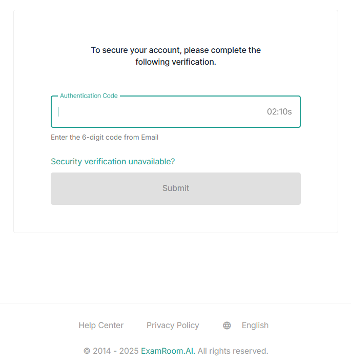 If you haven’t received a code, click the “SecurityVerificationUnavailable?” option available above the submit button (This step only applies if enabled by your exam sponsor).