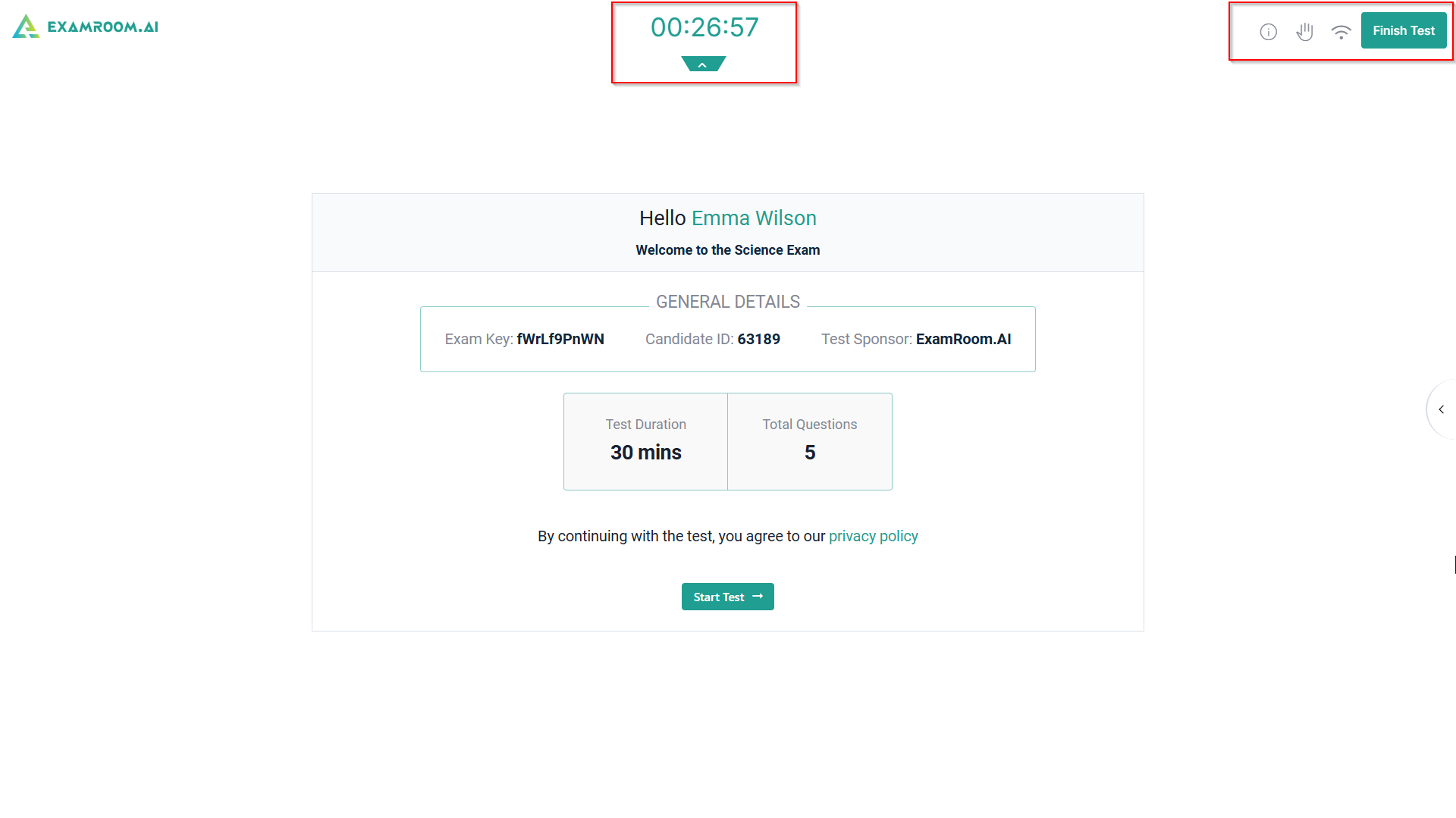 As you open the drop-down menu, in the center, a timer is displayed; it shows the remaining proctoring time. On the right side, there is an information icon, which shows details about the exam. Next is an icon to raise a hand, which can be used to contact the proctor during the exam. The next icon is for Wi-Fi, to check connectivity. Lastly, there is the Finish Test button, which can be used to complete the test at any point during the exam.