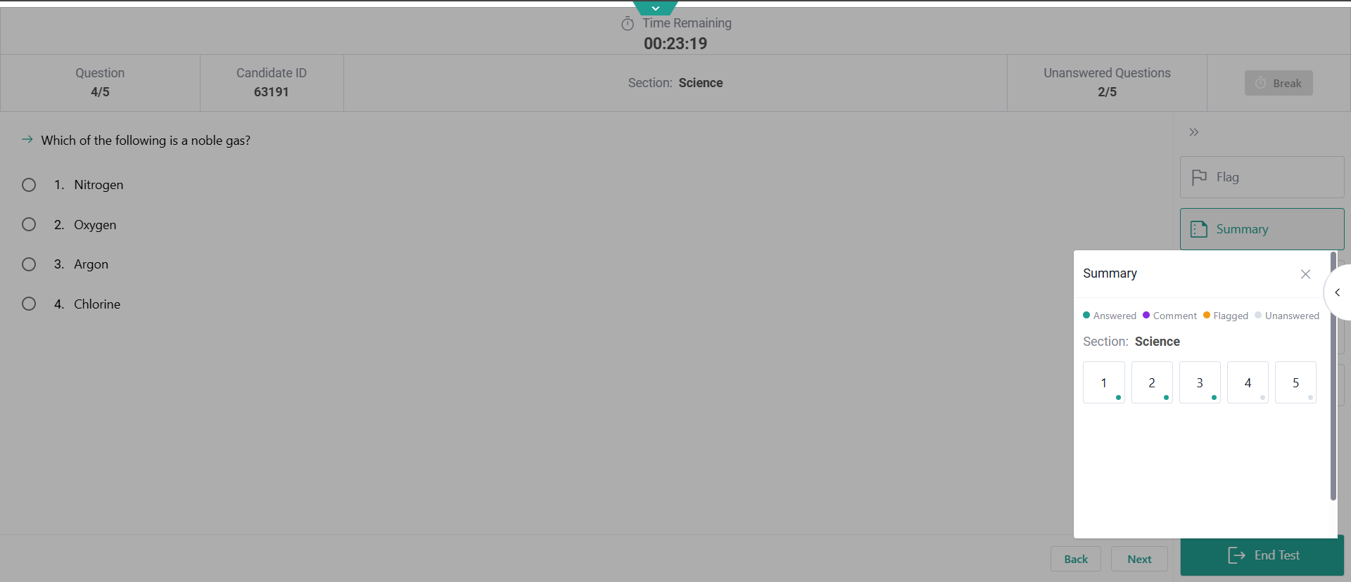Click Summary to view an overview of your exam. It shows which questions you've answered, commented on, flagged, or left unanswered.